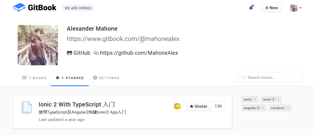 进入之后找到对应的书籍,点击后面的Star按钮,然后可以通过自己GitBook上的STARRED找到收藏的书籍,如图: