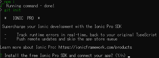 然后出现提示是否安装免费的Ionic Pro SDK并连接你的应用程序,选择y