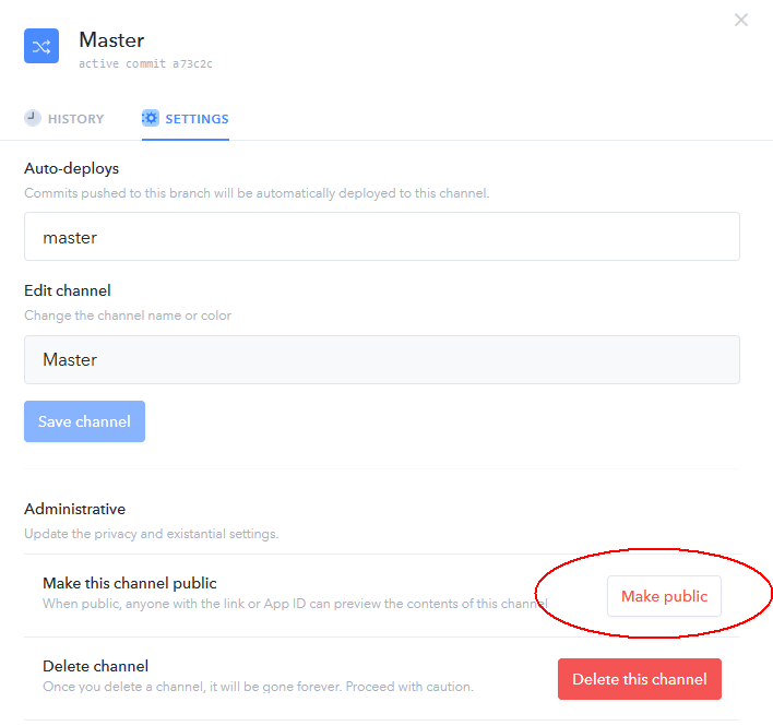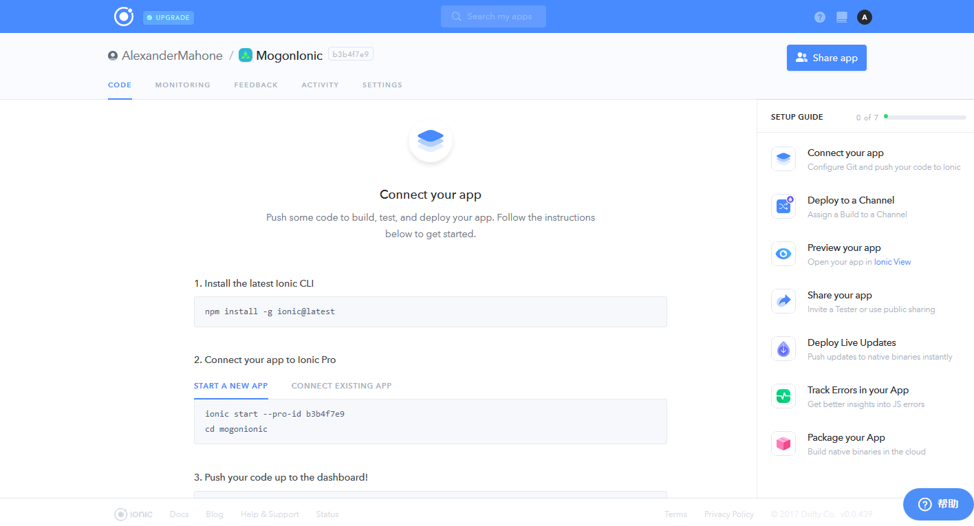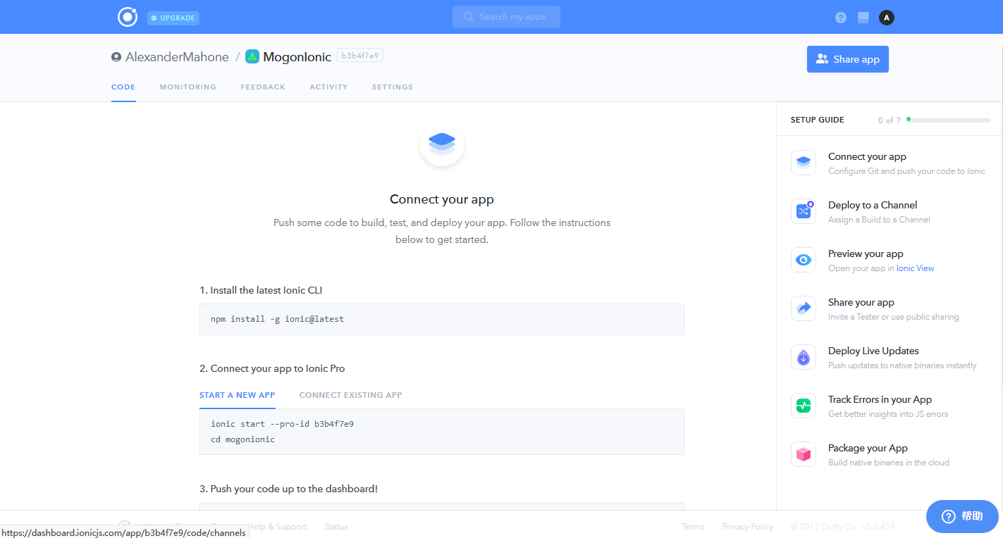 通过Connect your app下方的步骤,将项目上传或链接到此App中,当上传完成后,需要在手机上下载此软件,然后登陆,或者直接输入上方页面中App名字旁边的ID进行App的查看,如果选用后者进行查看,需要将Channels设为共有