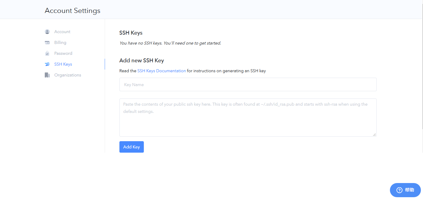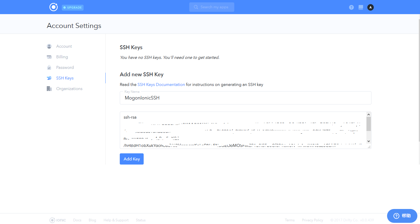 然后输入一个名字,将公钥粘贴到下方,并点击Add Key完成SSH配置,接下来返回App页面: