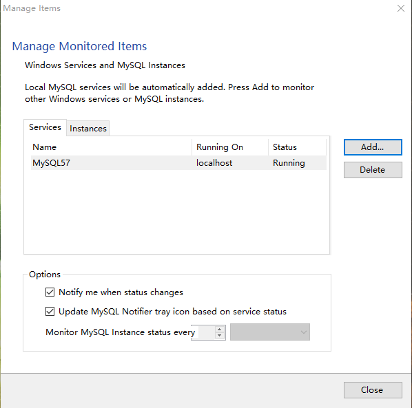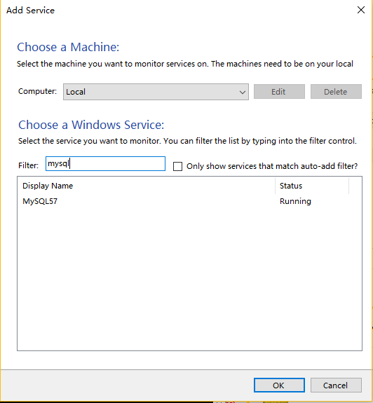 然后将Services中的内容,和Instances中的内容全部删除,之后再Services页面,点击Add Windows Service,Filter中写入mysql,然后在下方选择MySQL57,点击OK即可。然后点击mysql图标,start即可。